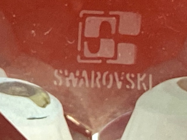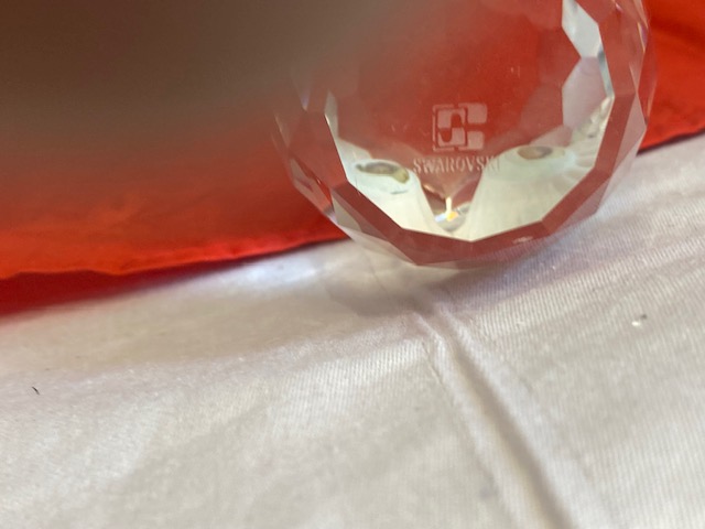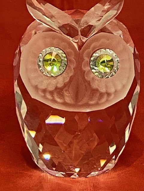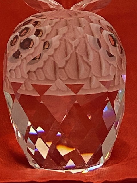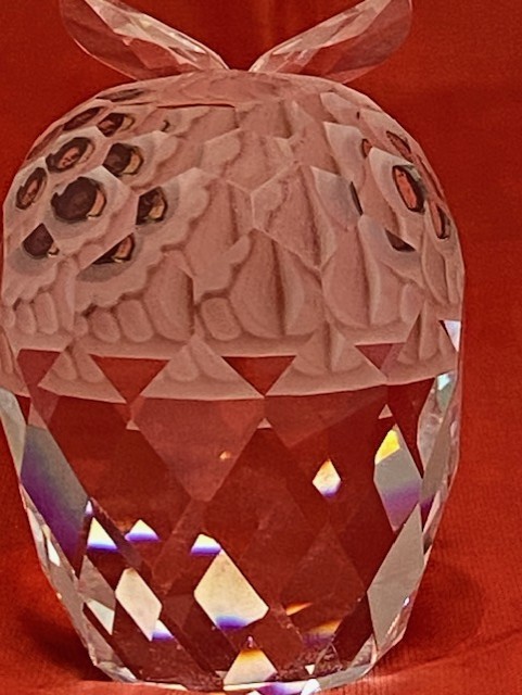 A Swarovski crystal owl no box made in the 1970s as part of their ‘Woodland Friends’ collection, designed by Max Schreck. The bulbous facet cut body has a frosted glass face with greeny yellow crystal eyes, the whole thing topped by two large crystal ears. It has the Swarovski logo etched on the bottom, which dates it to the 1970s. Very characterful and charming, and it shines and glitters in the special Swarovski Crystal way. 3 inch tall