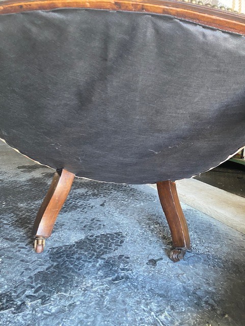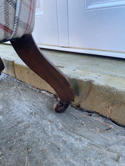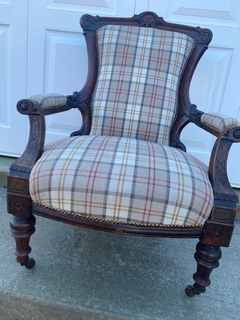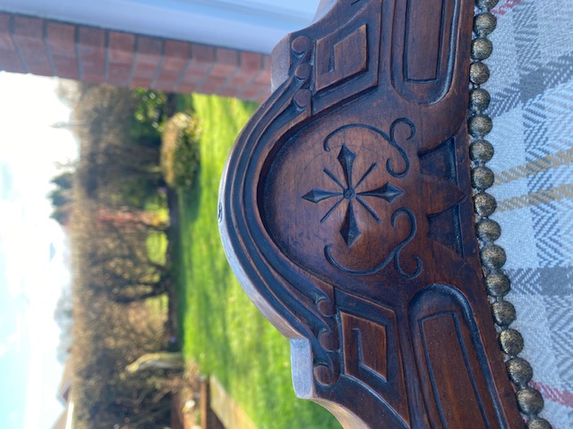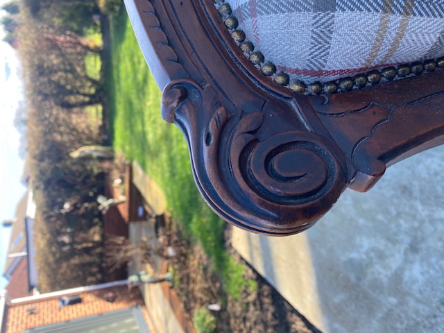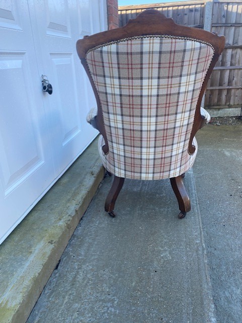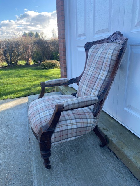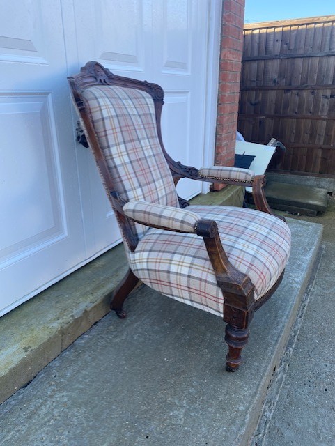 Edwardian mahogany grandfather chair in very good condition professionally upholstered about 2 years ago cost over £300 this is my own chair only selling due to downsizing standing on turned front legs with square splayed rear legs all legs have ceramic casters not saggy very comfortable to sit in (i also have six dining chairs in a separate listing covered in same fabric). The chair has nice carving to the top and on the arms stands 16 inch to seat 39 inch to top of back and 28 inch wide across the arms