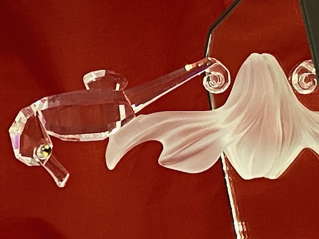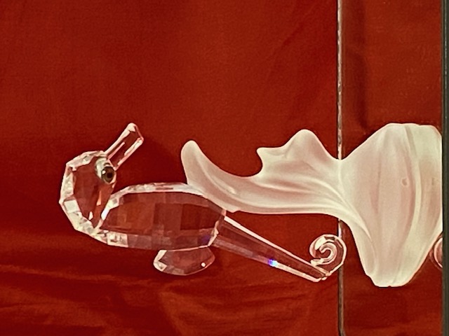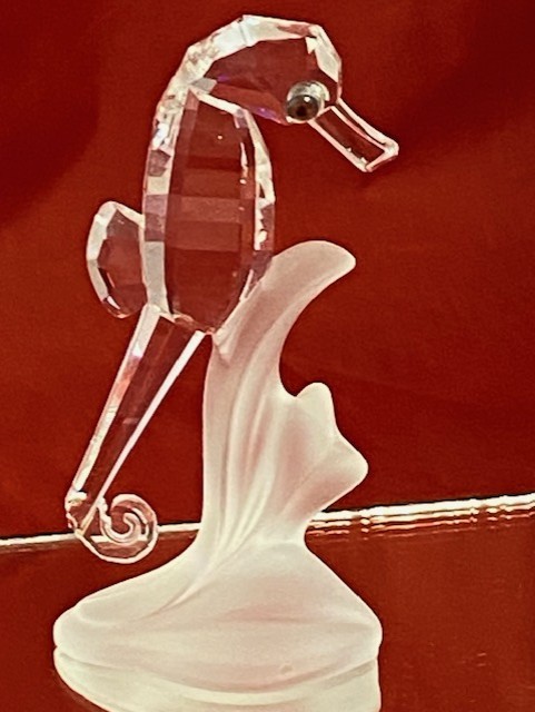SWAROVSKI SEA HORSE BOXED This retired Swarovski crystal seahorse is made from clear crystal and is attached to a frosted piece of crystal. The seahorse was originally part of the “South Sea” collection, later being moved to the “Aquatic Worlds” theme.