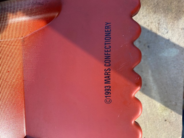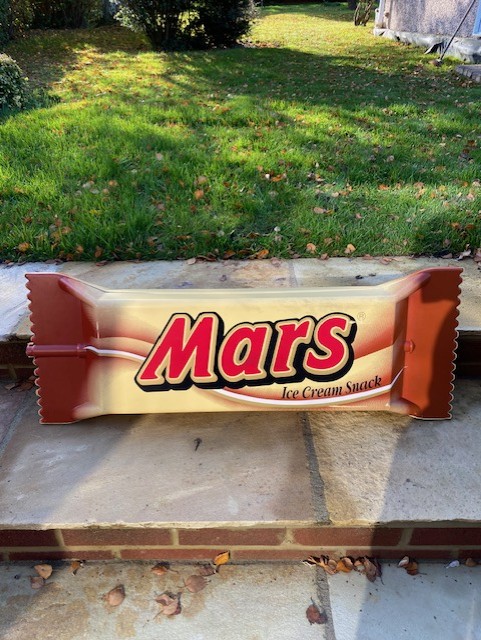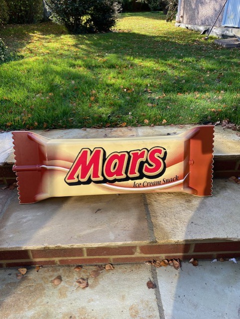 Vintage Mars double sided ice cream snack shop display sign .This sign stood upright on a metal stand which is not with the sign dated 1993 this looks great and would look good in any man cave ice cream shop great display piece hard to find made from hard resin 37 inch long by 13 1/2 inch wide and 6 inch deep